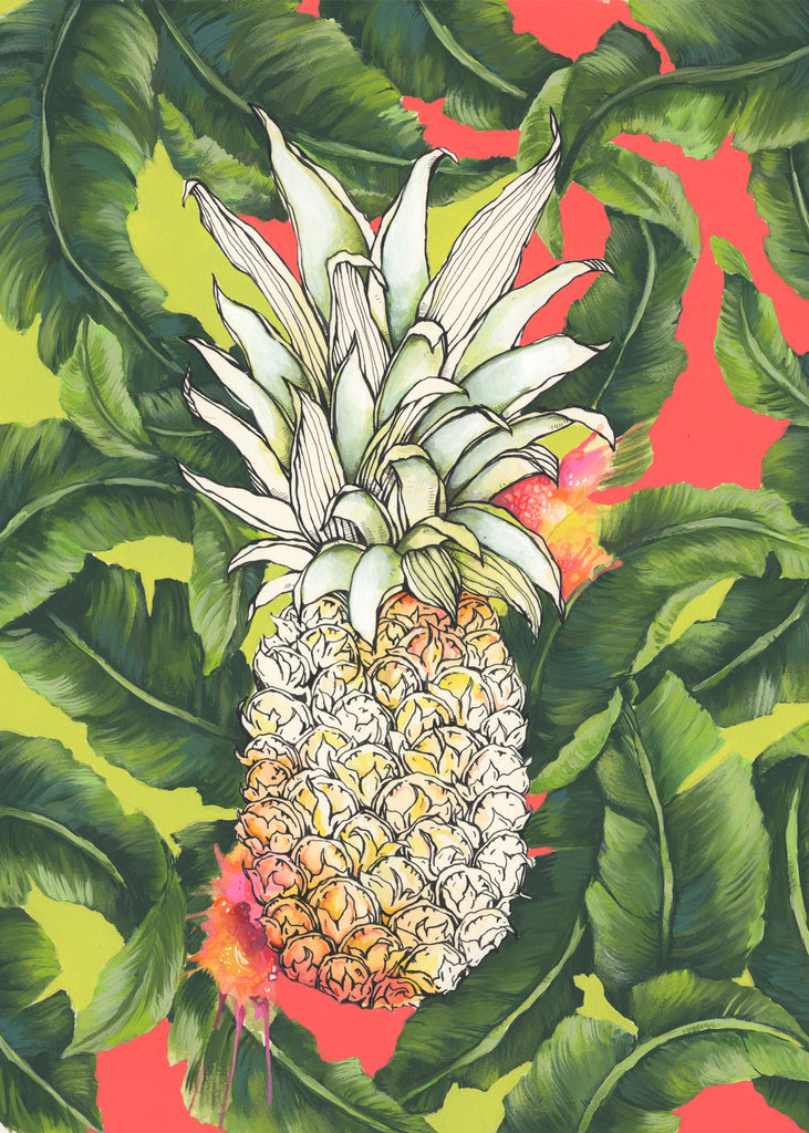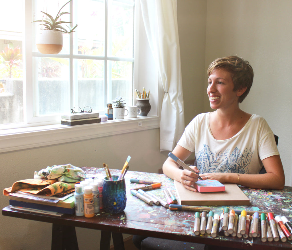 My paintings are usually created with watercolors, paint markers, pen, acrylic and ink. They lean towards organic and whimsical representations of Hawaii.