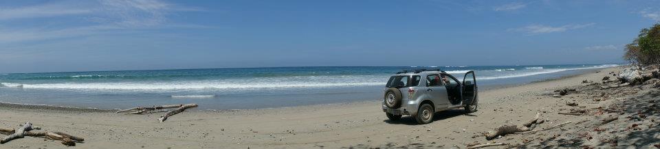 Just west of Playa Hermosa, we pulled off at a fruit stand in a little town and hid our bags in the trunk. I put the key into the door to lock the car and turned it, only to have the key beak in half with the toothy part of the key stuck in the lock. The car made a locking noise and… whoops… we were locked out of the car with all our money and identification inside.