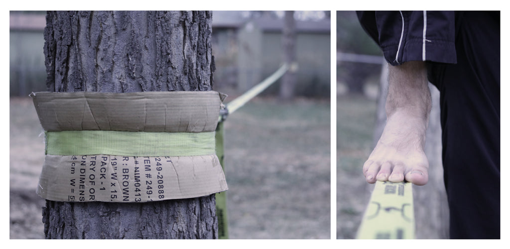 - A slackline (you can buy a kit from several retailers, or make your own primitive line). It’s recommended to start on a shorter line – 15 to 20 ft or so. The short distance allows you to keep the line nice and tight.