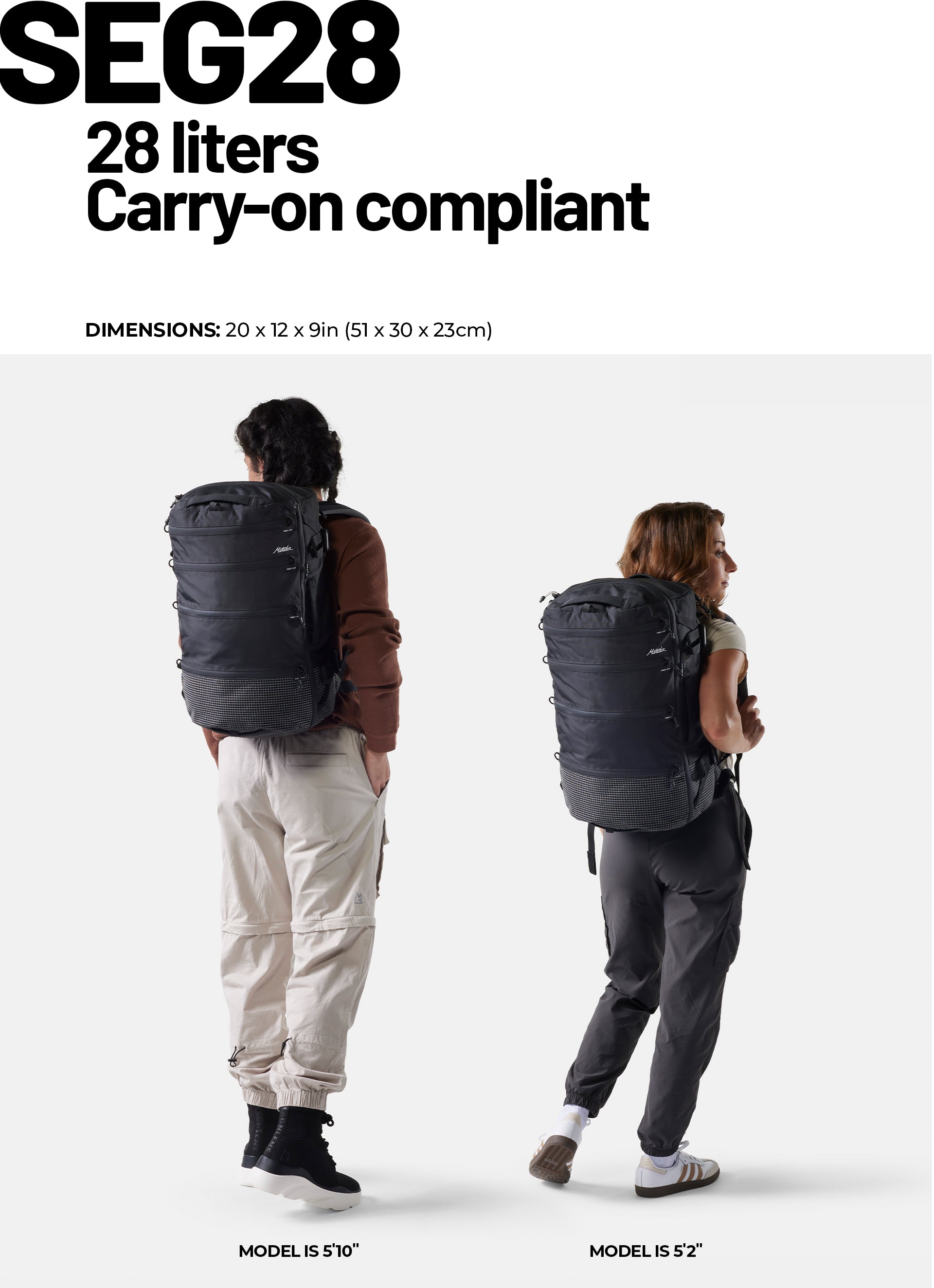The SEG28 is an excellent daily-carry backpack for people that need organization throughout their day. The segmented pockets lend themselves to organizing by activity or item- isolating work essentials, lunch, a change of clothes, gym shoes, and tech accessories. If you are the kind of person that sets out in the morning for a full day, the SEG28 will quickly make you wonder how you ever got by without it. Most Matador® team members choose to carry a SEG28 for this reason. Combining your daily carry with a travel-ready personal item is efficient and effective, letting you maintain more of your routine when you’re away from home.